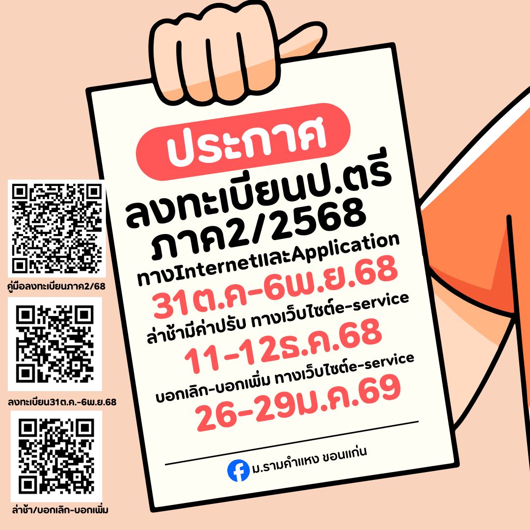 กำหนดการลงทะเบียนสอบซ่อม ภาค2และซ่อมภาคฤดูร้อน/2567#ส่วนภูมิภาค ทางinternetระหว่างวันที่ 28 ก.ค.- 1 ส.ค.68https://iregis2s2.ru.ac.th/reexam/region_verify.jspรายวิชาลงทะเบียนเรียน https://drive.google.com/file/d/1muEyuzOsAwJ4BDb_kfLVPdliagXIlF0o/view?usp=drive_link
