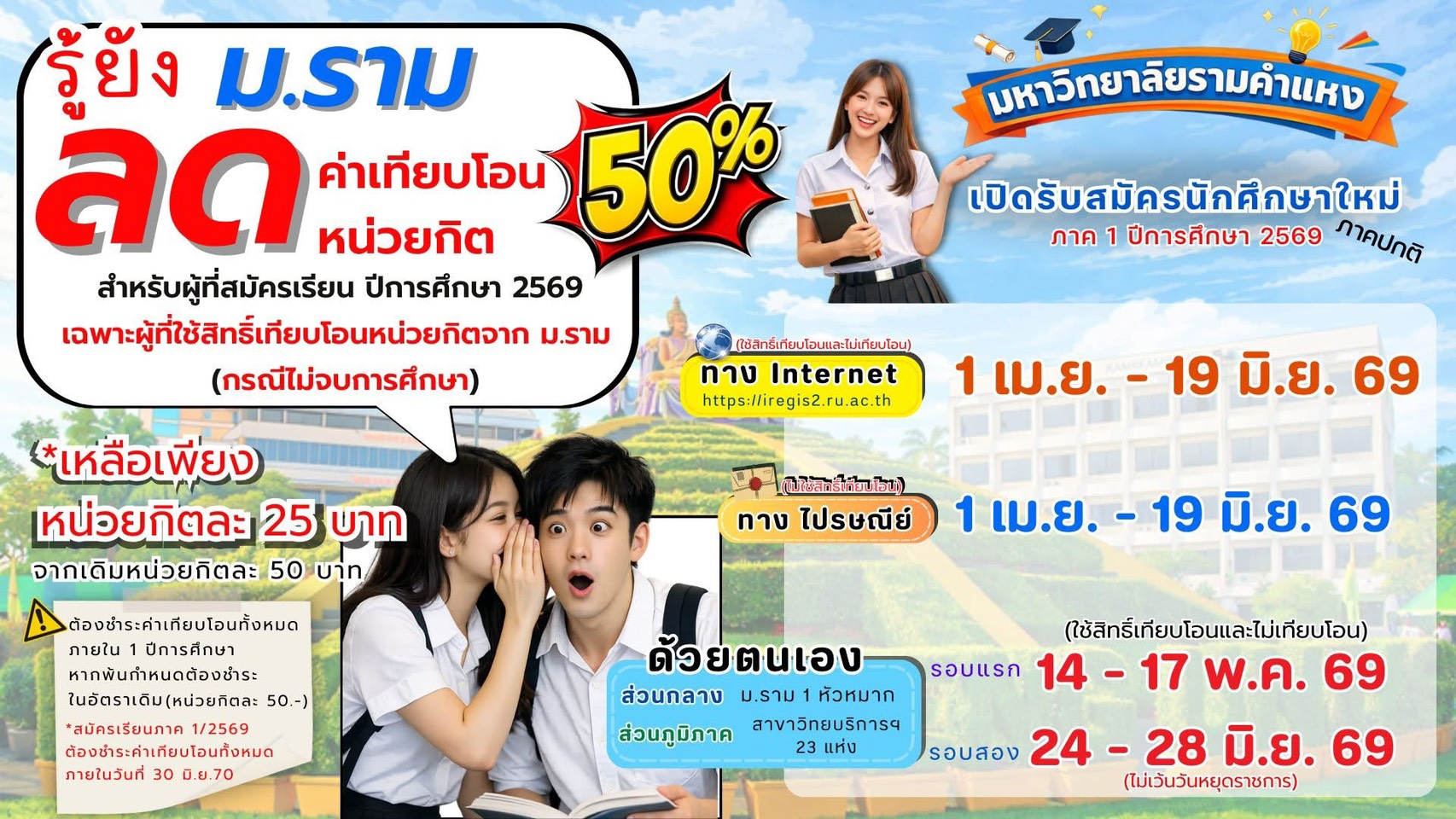 รหัสเดิมใครยังไม่จบ ม.รามลดค่าเทียบโอนให้ 50% นะ #มาสมัครกันเถอะ #สมัครเรียนปี69 #ลดค่าเทียบโอน #เฉพาะใช้สิทธิ์เทียบโอนกรณีหมดสถานภาพจากรหัสเดิม #เทียบโอนจากพรีดีกรี...