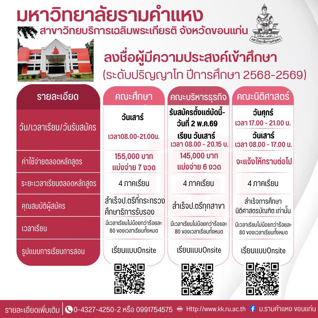✅ ยื่นใบสมัครด้วยตนเองได้ที่มหาวิทยาลัยรามคำแหง สาขาบริการเฉลิมพระเกียรติ จังหวัดขอนแก่น